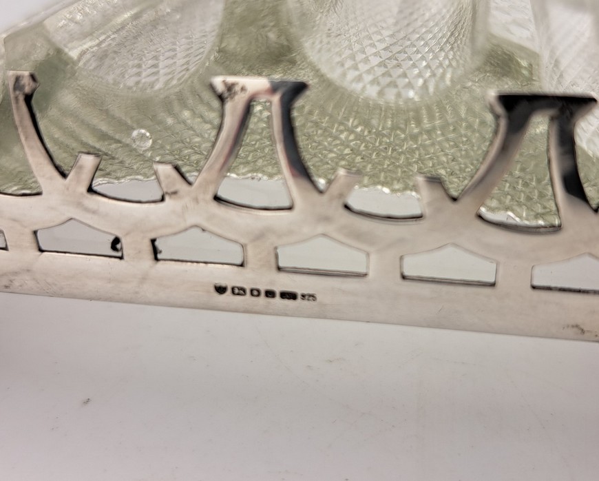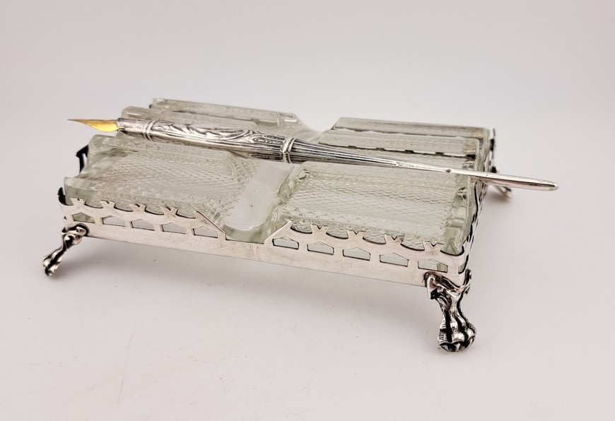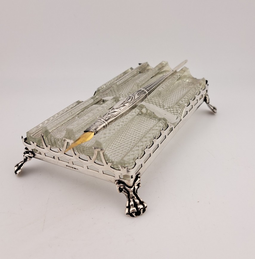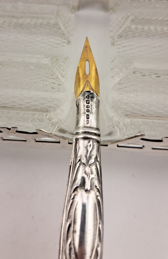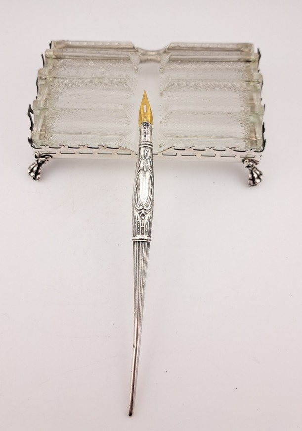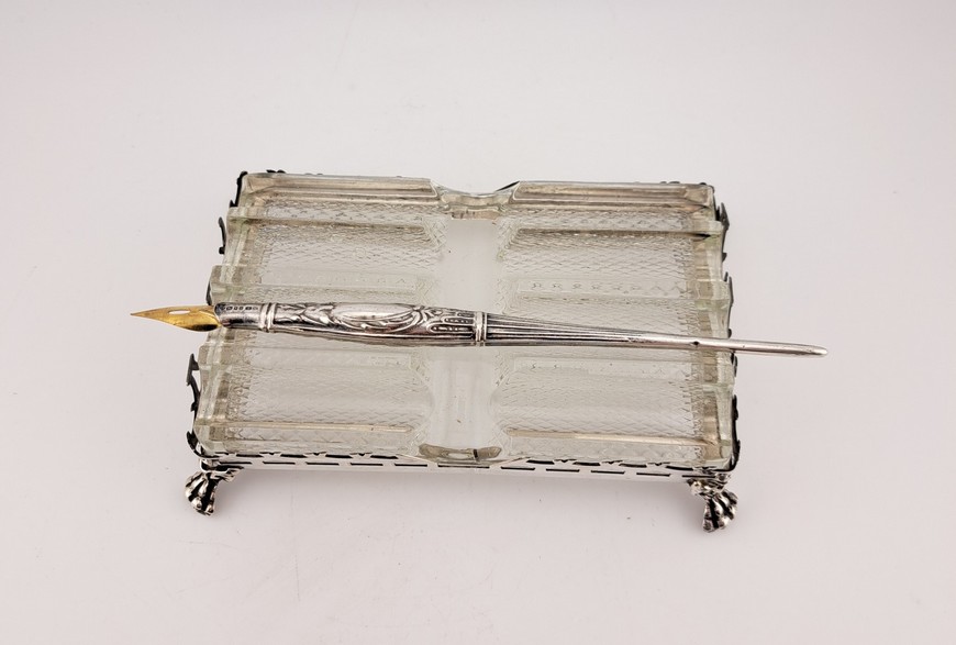 Pennenhouder zilver en kristal met zilveren kroontjespen, Ari D. Norman, Londen, ca.1970. Originele set.