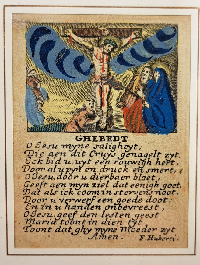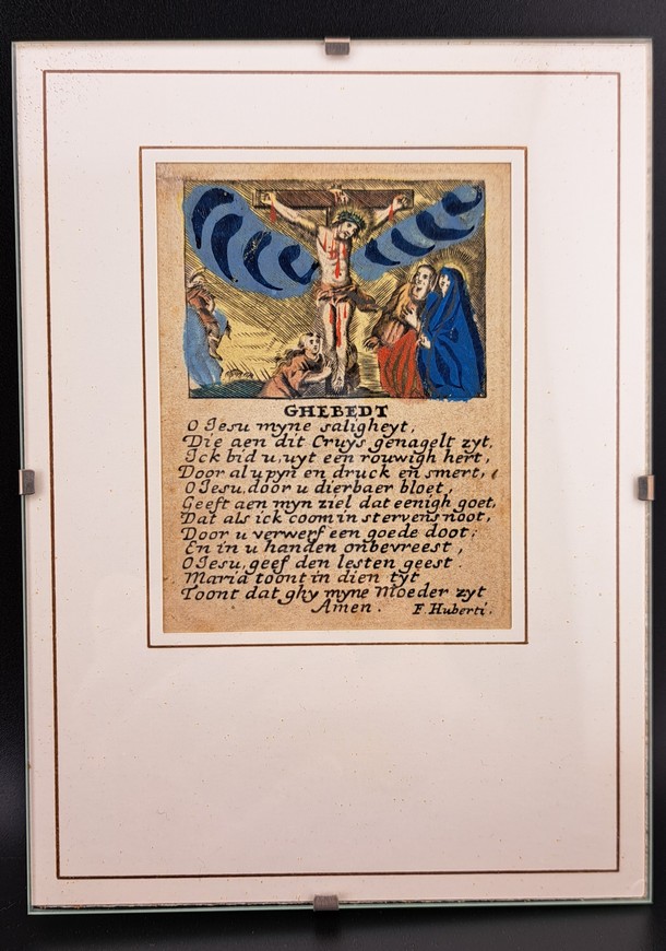 Antiek devotieprentje, F. Huberti, België, 1630-1687, Ingekleurde ets.