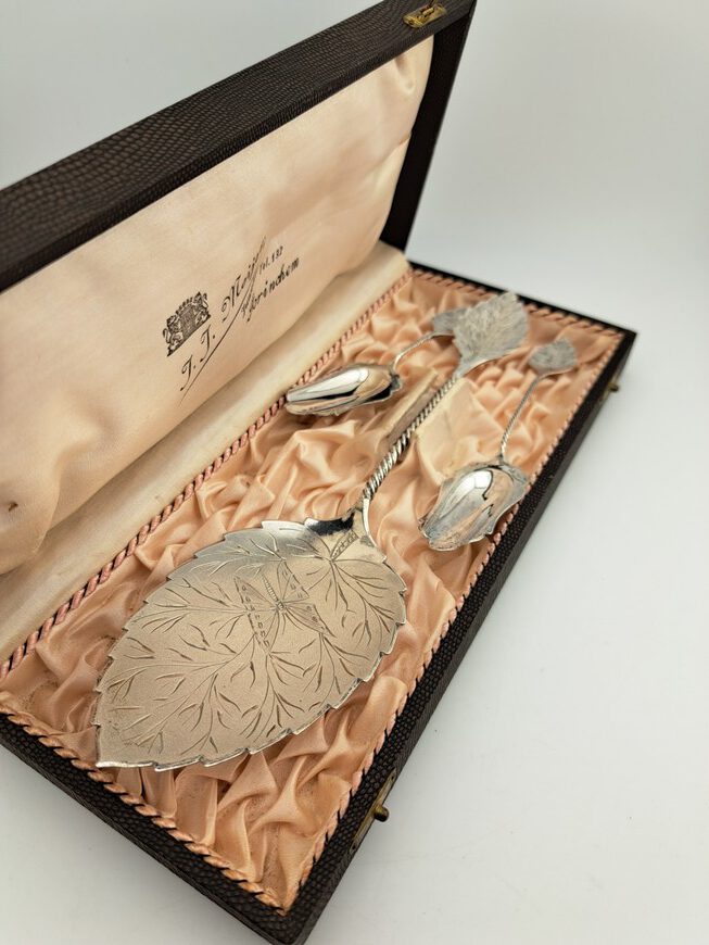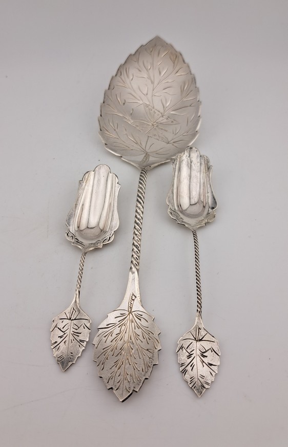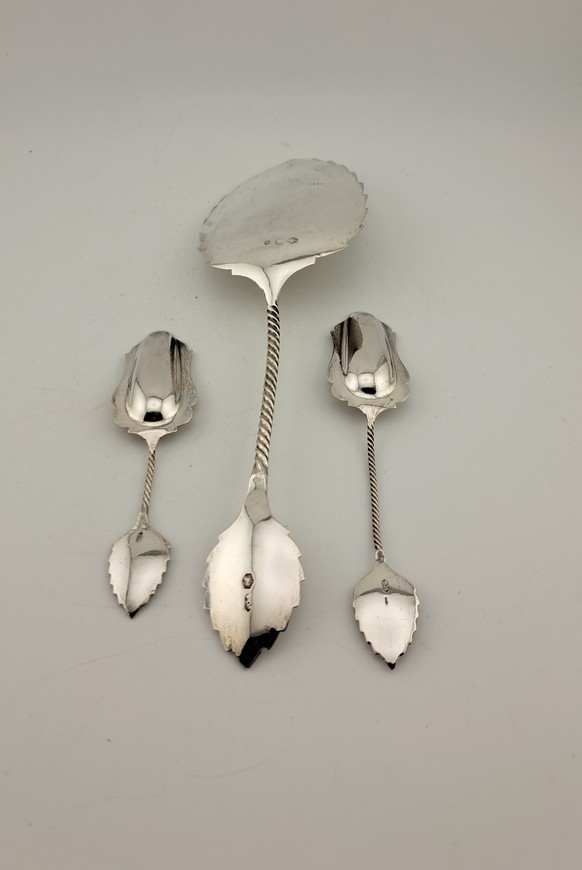 Afmeting: taartschep 220 mm, suikerschepje 125 mm, theeduimpje 104 mm.