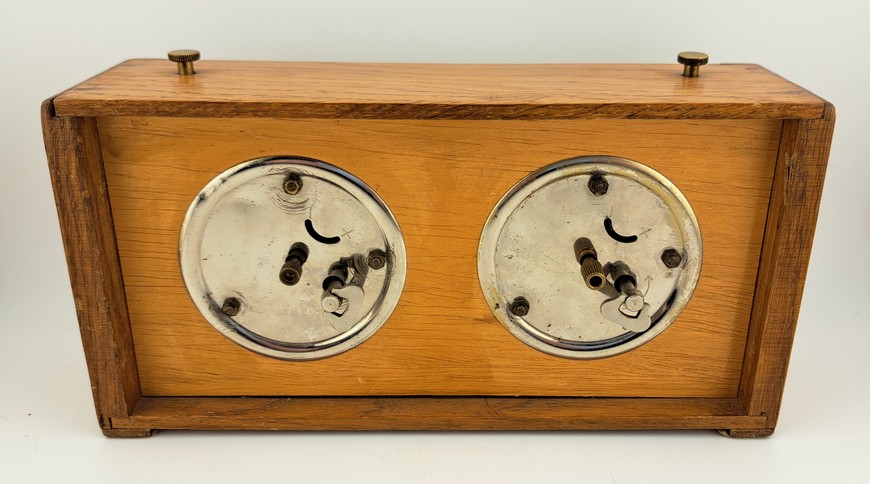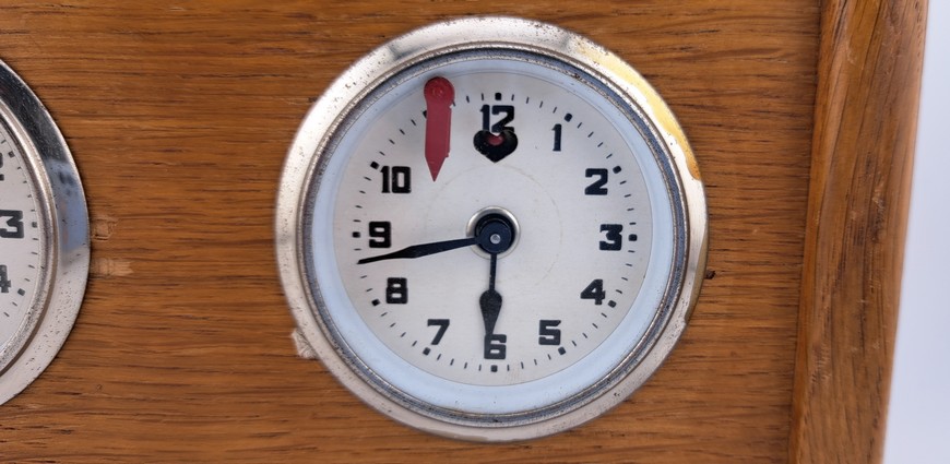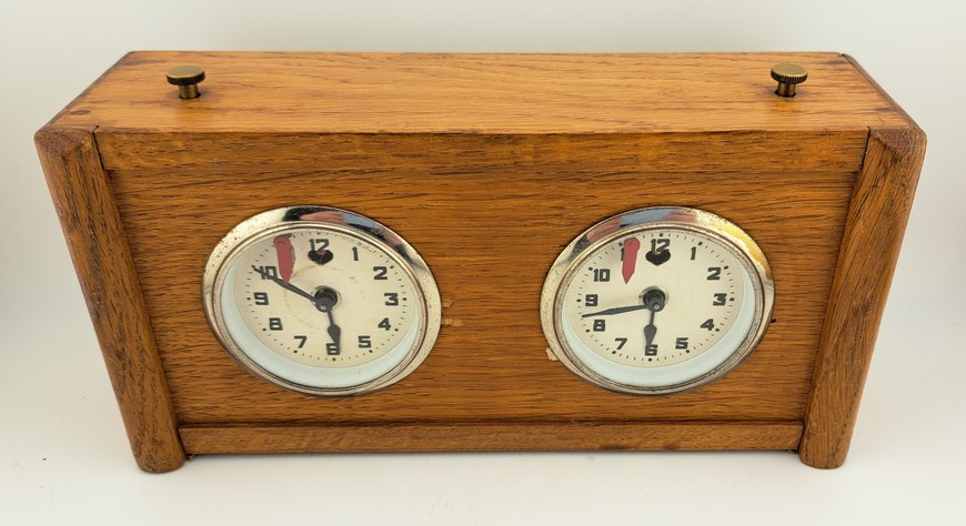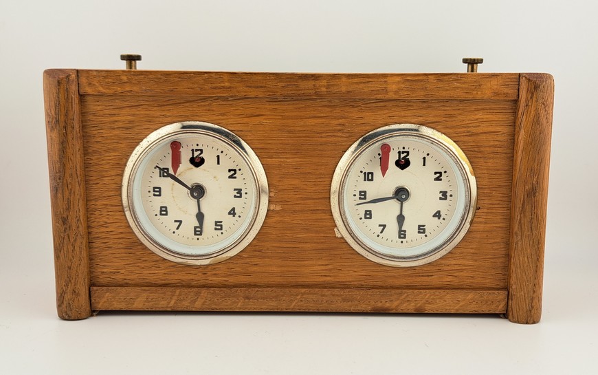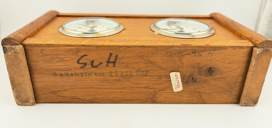 De firma Koopman heeft vanaf de jaren 1930 t/m de jaren 1990 schaak/damklokken gemaakt. Deze schaakklok heeft jarenlang dienst gedaan voor de schaakclub SV Hardenberg. De klok verkeert in zeer goede conditie en beide uurwerkjes lopen nog uitstekend. Een leuk detail is dat de “slingertjes” te zien zijn in het hartvormig uitgesneden deel onder de cijfers 12. Op de onderzijde staat het Koopman garantiestempel “Garantie tot 1962”. Koopman verkocht zijn klokken met een optie voor 1 of 2 jaar garantie. Pak uw schaakset uit de kast, schenk uzelf een goed glas whisky in met daarbij een fijne sigaar en voilà, u reist terug in de tijd naar de gezellige jaren 60. Een goede Schots gambiet, veel plezier!