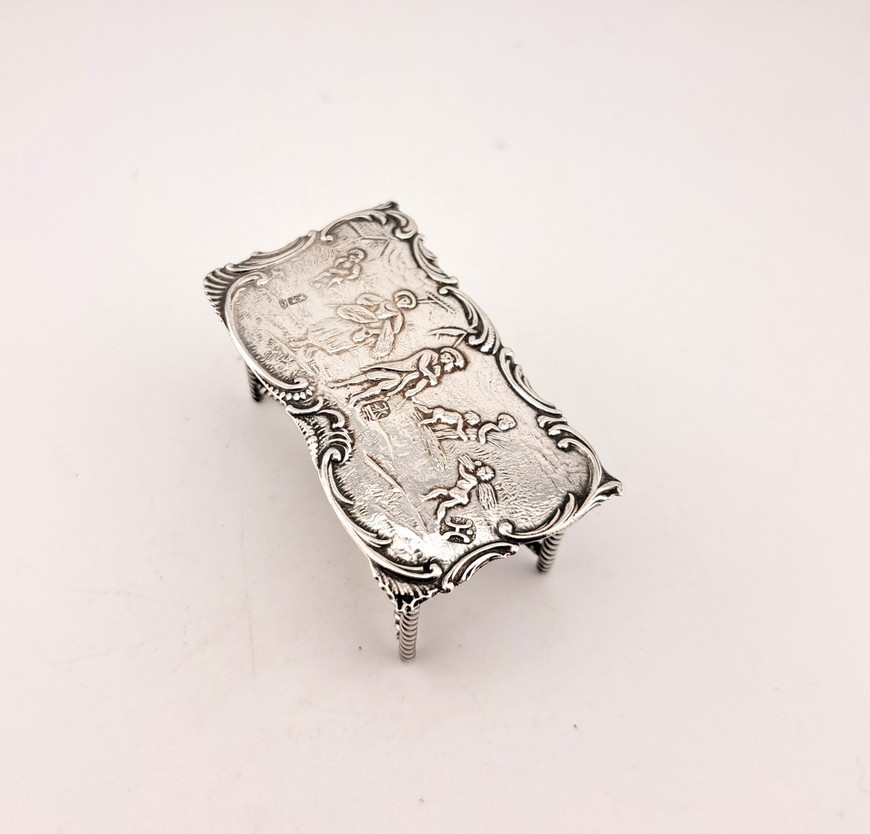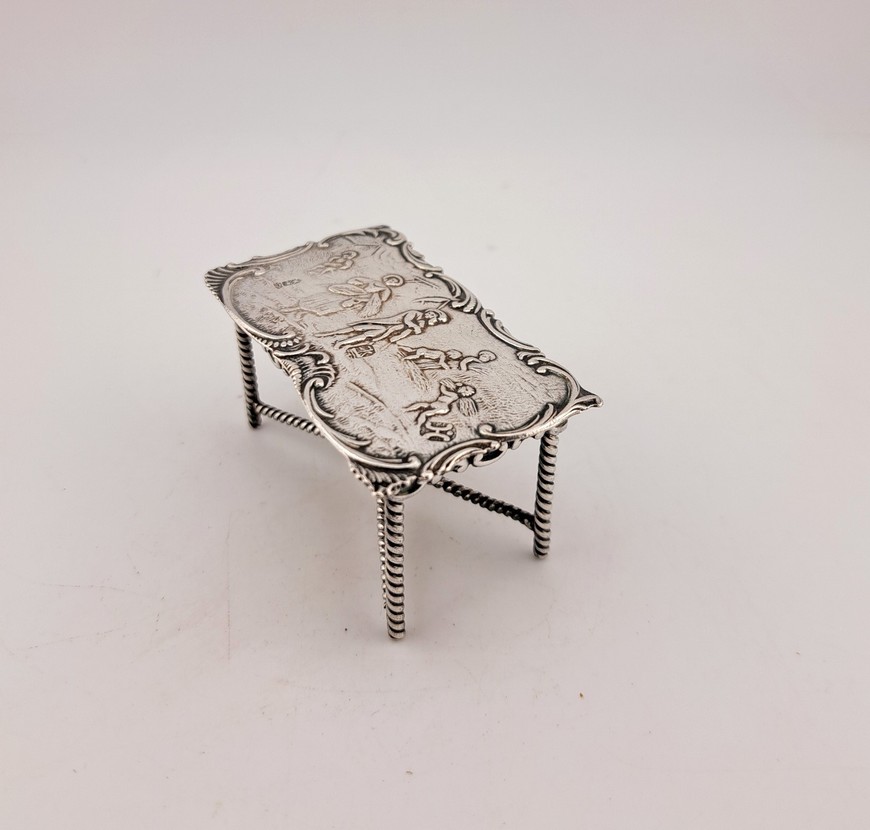 Antieke miniatuur zilveren tafel, eind 19e eeuw. Er staan ook nog 18e -eeuwse pseudokeuren op de tafel. Op het blad van de tafel staat een afbeelding dat het koren geoogst wordt.