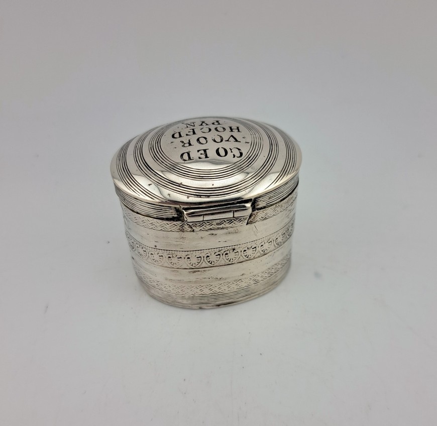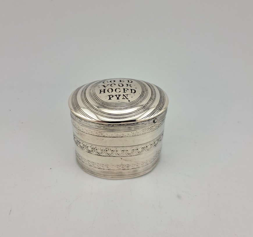 Antiek lodereindoosje, zilver, Paulus Riddersma Cabboes, Leeuwarden, jaar 1845. Op de deksel staat Goed Voor Hoofdpijn.