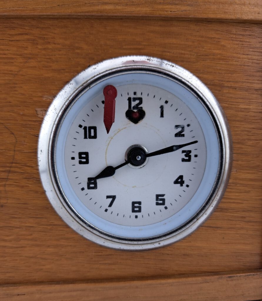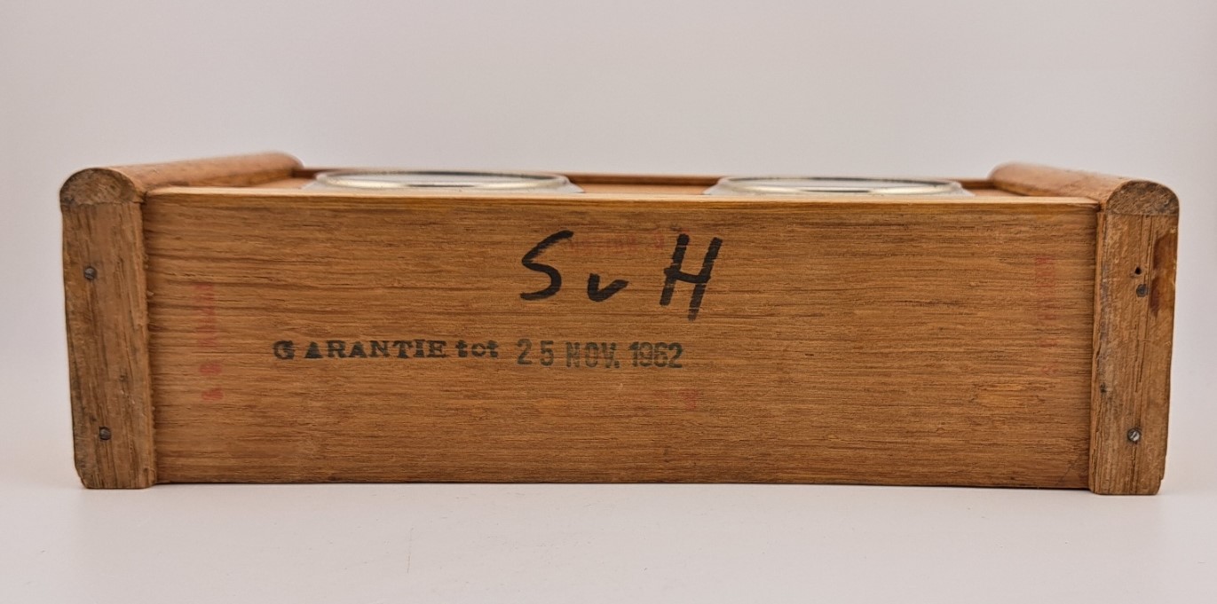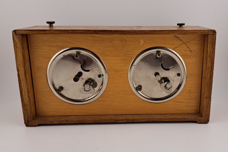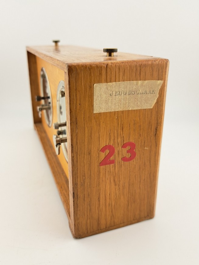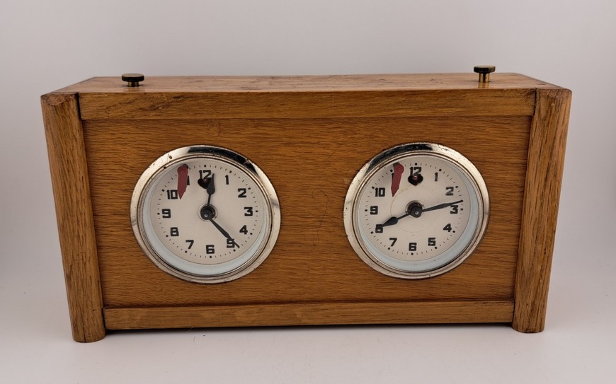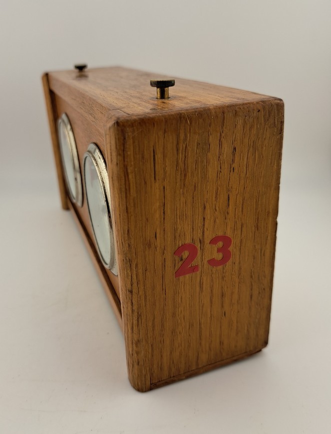De firma Koopman heeft vanaf de jaren 1930 t/m de jaren 1990 schaak/damklokken gemaakt. Deze schaakklok heeft jarenlang dienst gedaan voor de schaakclub SV Hardenberg. De klok verkeert in zeer goede conditie en beide uurwerkjes lopen nog uitstekend. Een leuk detail is dat de “slingertjes” te zien zijn in het hartvormig uitgesneden deel onder de cijfers 12. Op de onderzijde staat het Koopman garantiestempel “Garantie tot 1962”. Koopman verkocht zijn klokken met een optie voor 1 of 2 jaar garantie. Pak uw schaakset uit de kast, schenk uzelf een goed glas whisky in met daarbij een fijne sigaar en voilà, u reist terug in de tijd naar de gezellige jaren 60. Een goede Schots gambiet, veel plezier!