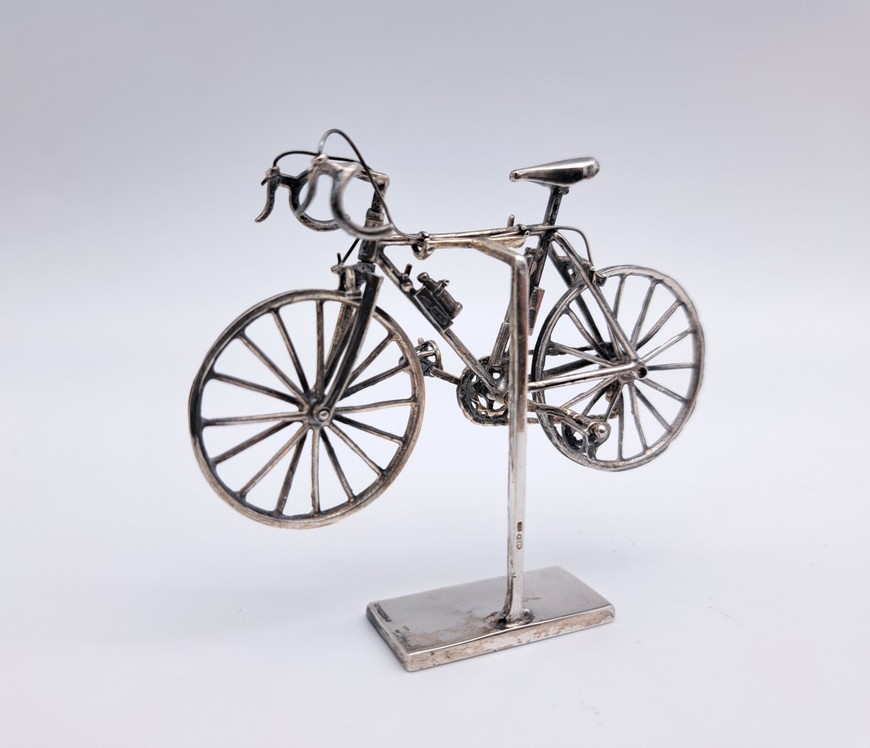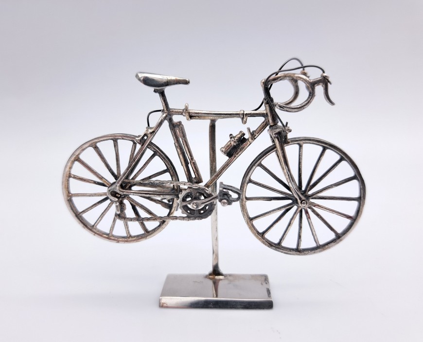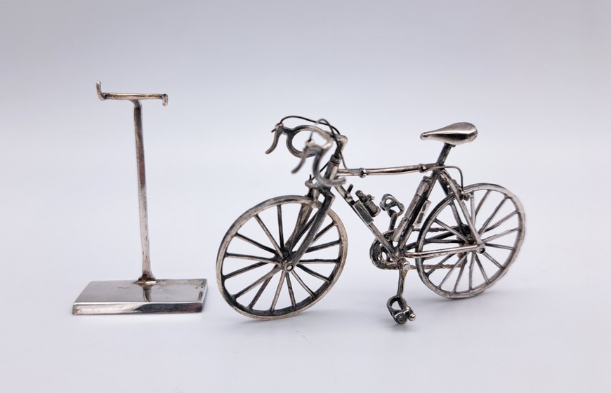 Miniatuur zilver, racefiets op standaard, Italië, 20e eeuw.
