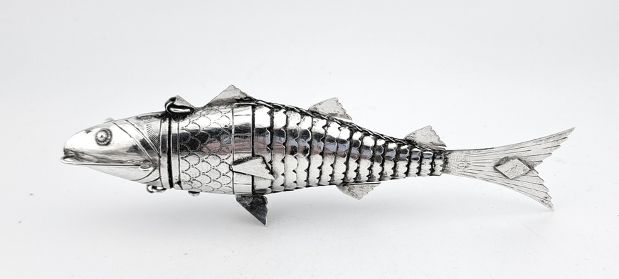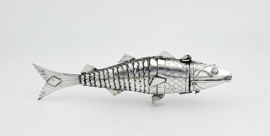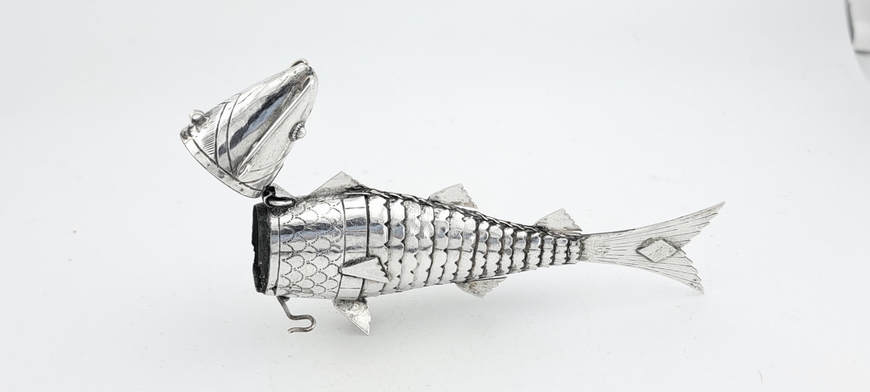 De besamim in de vorm van een vis. De scharnierende kop opent zich waarbij een deel van kop dienst doet als ruimte om specerijen in te bewaren. Verkeert in uitstekende conditie.