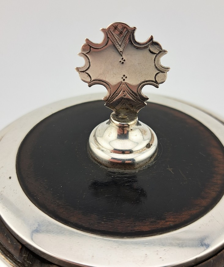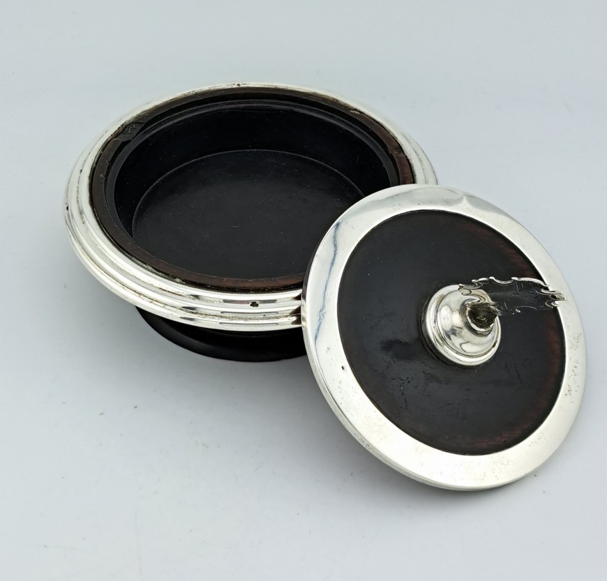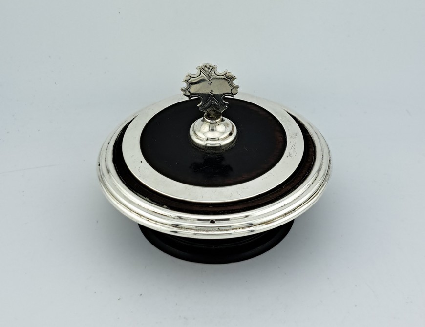 Antieke dekseldoos – hostiedoos, hout met zilver, Hollands, 19e eeuw.