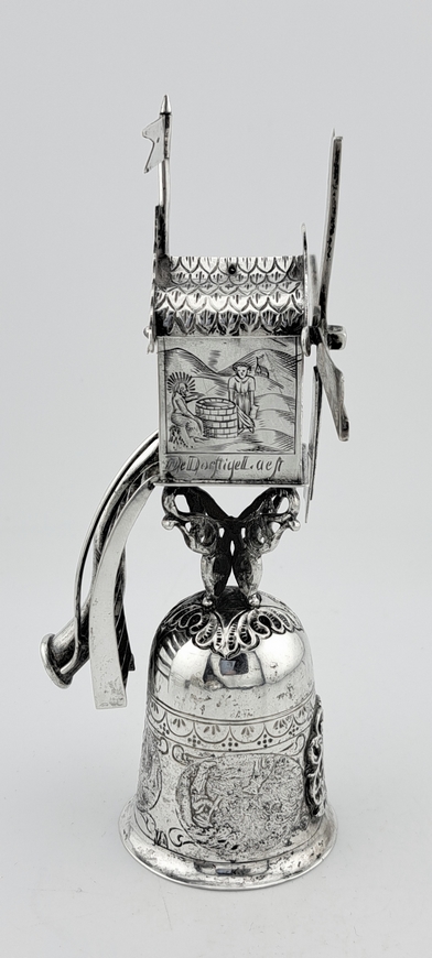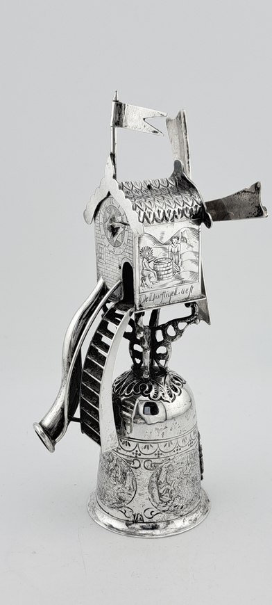 De molenbeker is voorzien van diverse versieringen. Op de zijkanten van het huisje staan de teksten: ‘Die Honghert Begaeft’ en ‘De Dorstige Laeft’.