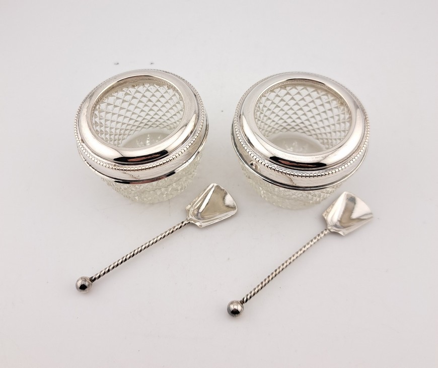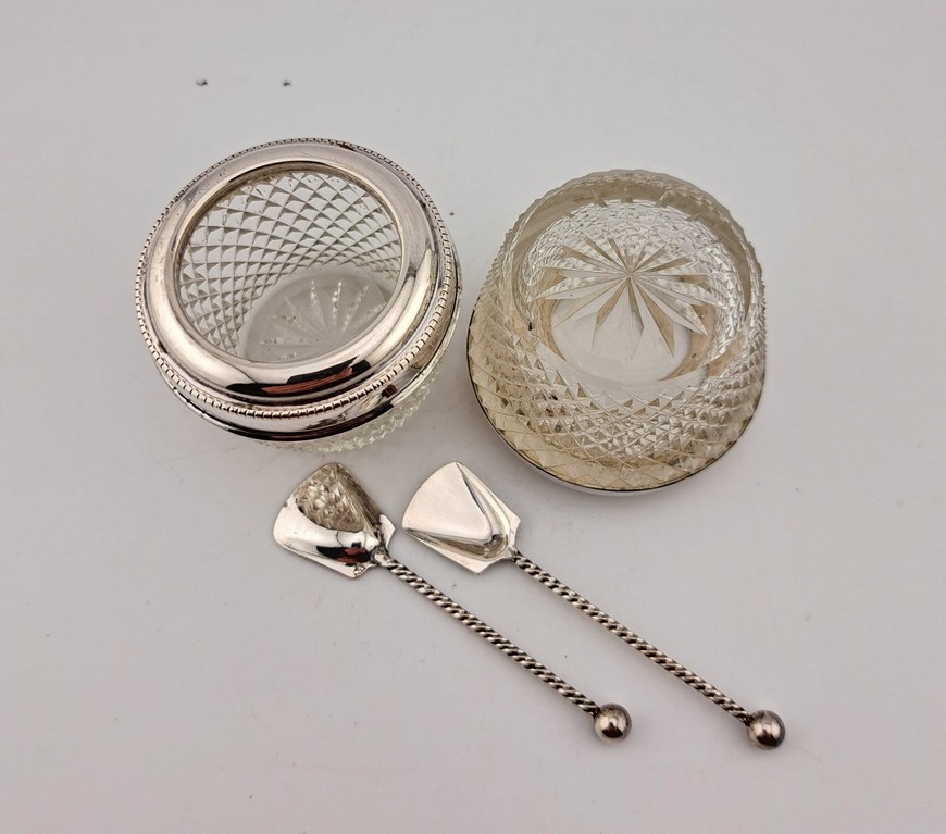 Antieke set zoutvaatjes met lepeltjes in foedraal, zilver met kristal, Bierenbroodspot, Amsterdam, 1921-1925