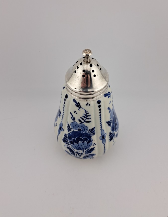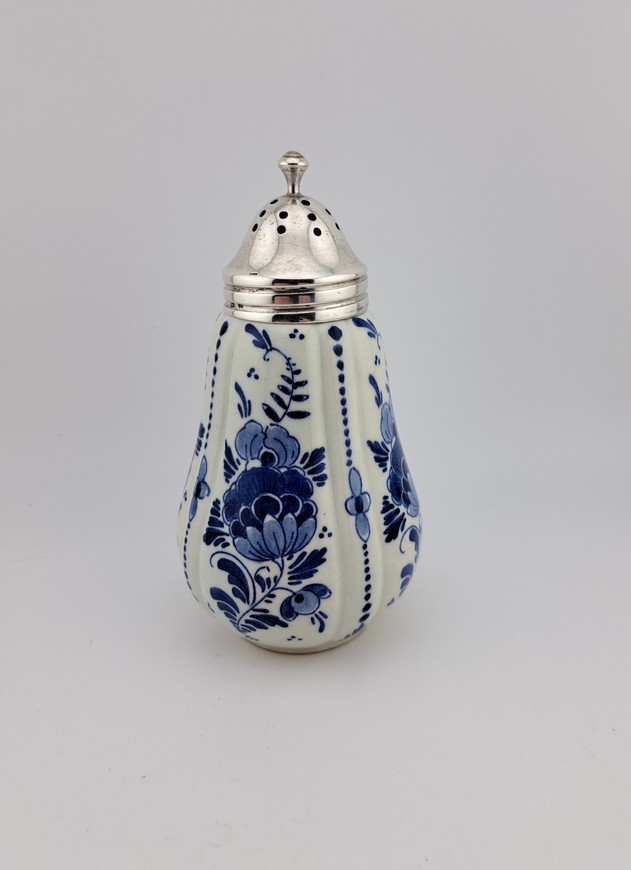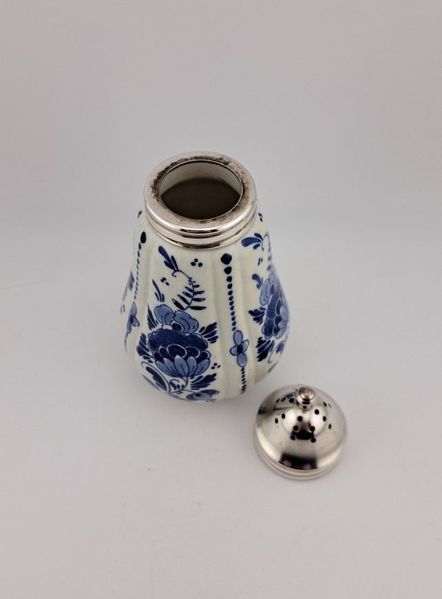 Antieke strooier, Delfts blauw met zilver, ca. 1920.