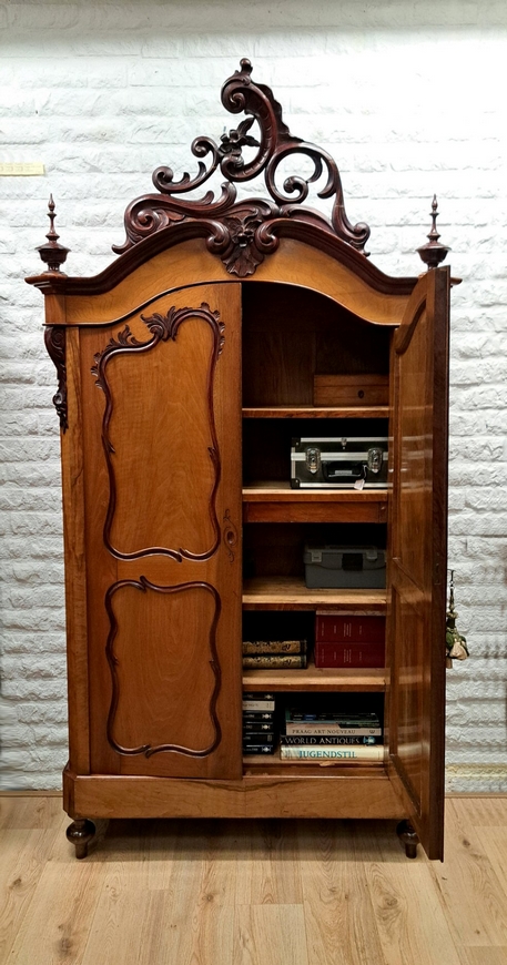 Achter de deuren vier legplanken waarvan één uitgevoerd met 2 lades. De kast is geheel demontabel en verkeert in originele, uitstekende conditie.