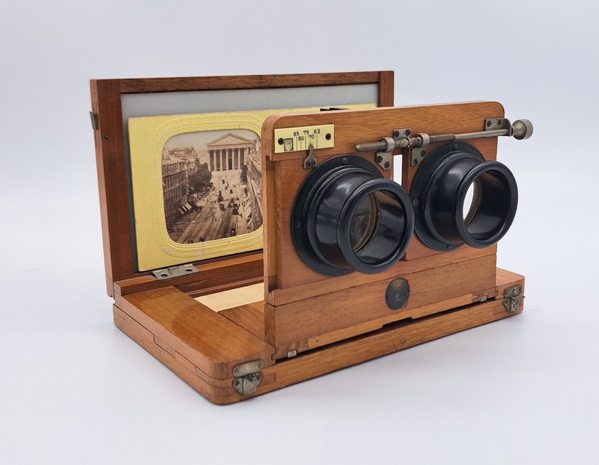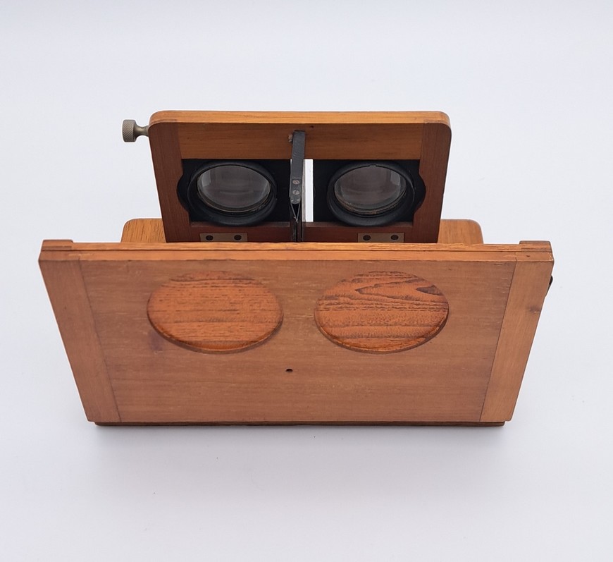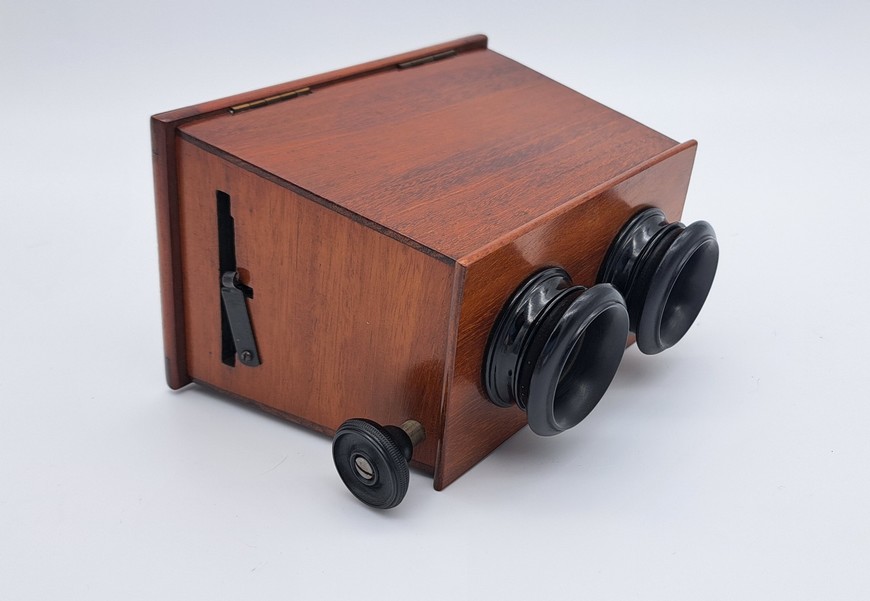 Antieke stereokijker, mahonie, 19e eeuw. Inclusief 1 stereofoto.