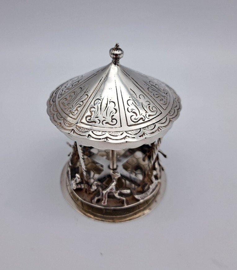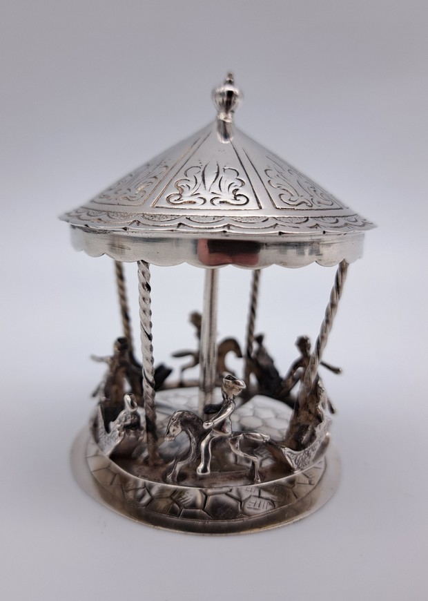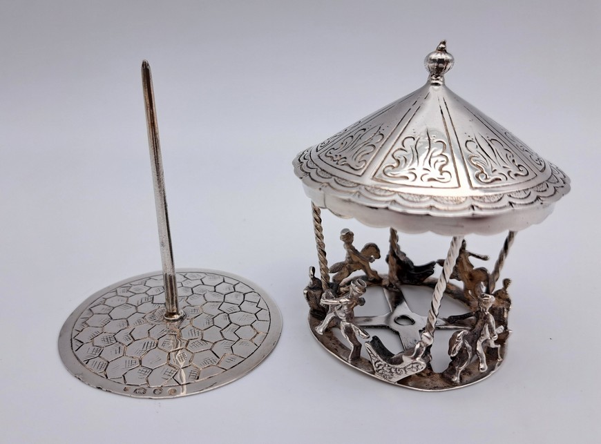 Het flesje is uitgevoerd met een schroefdop met geurstokje. Aan de oogjes is een ketting bevestigd waarmee het flesje aan een chatelaine bevestigd kon worden.