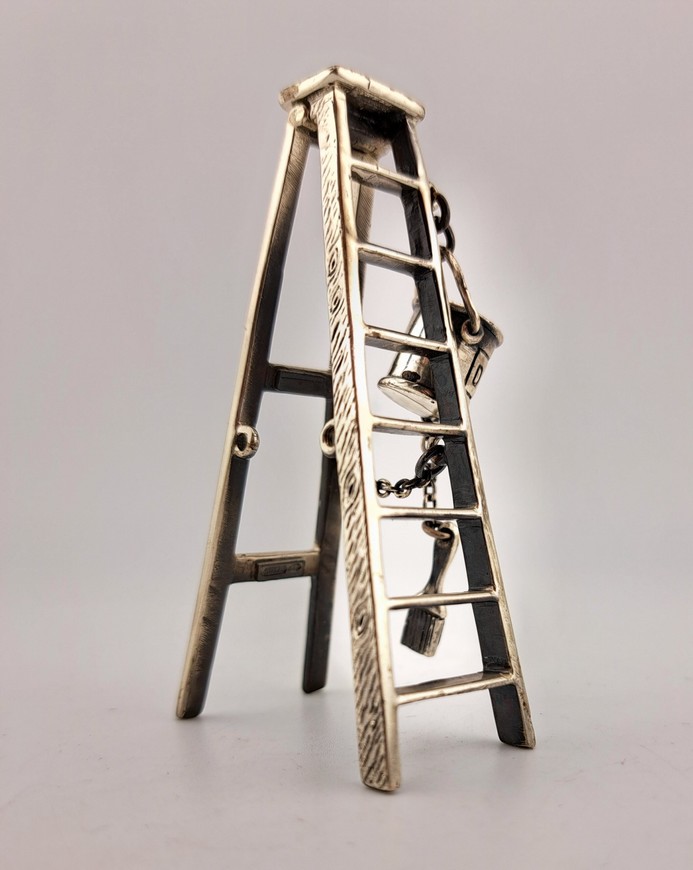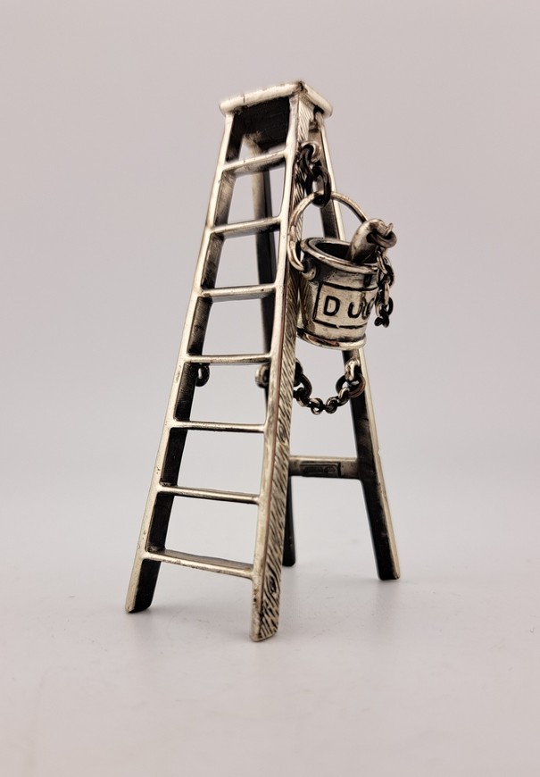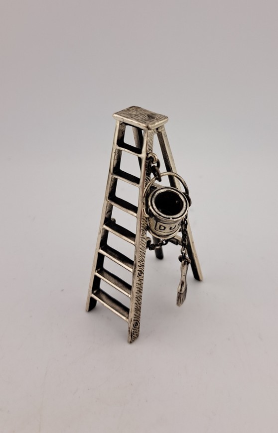 Miniatuur schilders trap, 1e gehalte zilver, Italië, 20e eeuw. Aan de trap hangt een verfemmer met Duco erop en een kwarts.