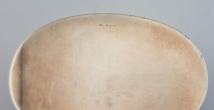Vergulde binnenzijde. Op het deksel afgebeeld een cherubijntje omringd door bloem- en plantmotieven.