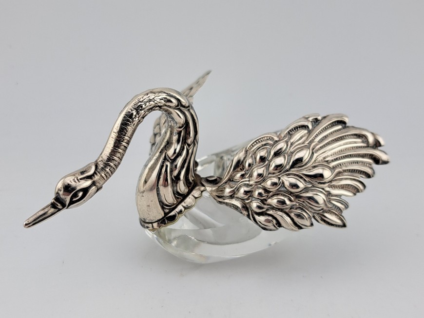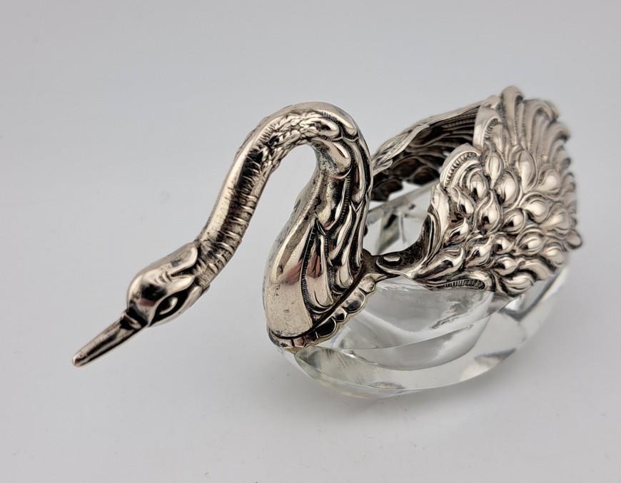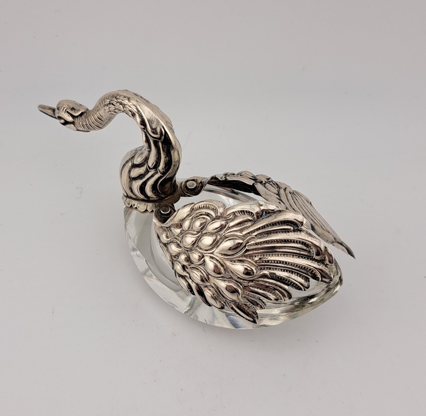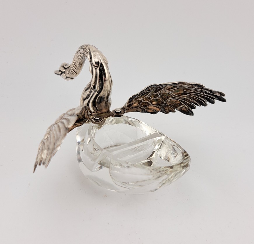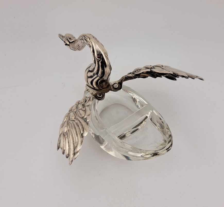 Zwaan peper & zoutbakje, kristal met zilver, 20e eeuw. De vleugels sla je uit om bij het zout en peper te komen.